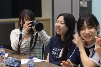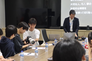 午前の企業訪問では、はじめに石井社長より、同社の歩みや今後の経済動向、ご自身のご経験を踏まえた、次世代を担う若者への力強いメッセージをいただきました。生徒たちは一言一言に真剣に耳を傾けていました。続いて、各事業の担当者から、多角的な視点に基づくレクチャーを受けました。カメラ事業では「決定的瞬間を逃さないカメラの優位性」について、また会社全体の視点としては「産業分野や医療分野など、幅広い領域でビジネスを展開している」ことについて説明を受けました。さらに、半導体事業では、身近な機器の中に同社の技術が幅広く活用されていることを教えていただきました。最後に人事の観点から、個々の能力を最大限に引き出す環境づくりの大切さについて学びました。