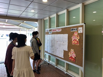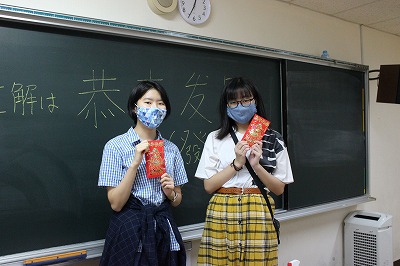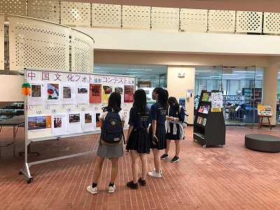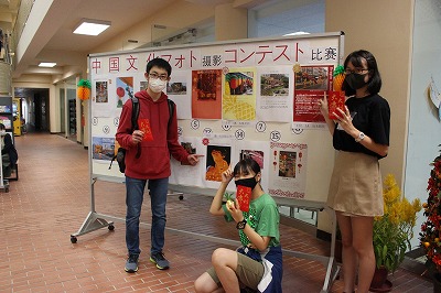 フォトコンテストでは、事前に応募した15名の作品をピロティに掲示し、生徒と教職員の投票で優秀作品を選出しました。財福をつかさどる財神や、ドラゴンダンス、ランタン・パイナップルの飾り、チャイナタウンのイルミネーションなどの写真が並び、本校も春節を祝うムードに包まれました。また各作品には財神の由来と信仰、ミカンやパイナップルに込められた新年を祝う意味などについて調べた文章も付けられ、作成した生徒と評価する生徒が、互いに中国文化を学ぶ良い機会にもなりました。