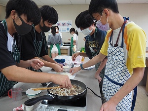 日中はクラスでのホームルーム、習熟度に分かれた授業などバディ生徒と一緒に普段通りの学校生活を体験してもらいました。放課後はクッキング部で親子丼作りに挑戦したり、生徒ホールでおしゃべりをしたり充実した時間を過ごしました。