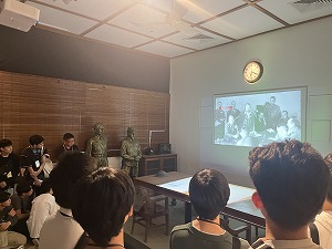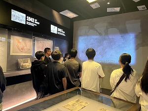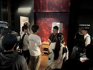 生徒たちは事前学習を行った後に博物館を見学し、日本軍による侵攻とシンガポールの降伏、華僑粛清(Sook Ching)など日本軍憲兵隊による住民への行い、日本語教育やインフレーション下での人々の生活など占領期の実相、戦後のシンガポール史などについて、英語のガイドツアーを通じて学びを深めました。日本のジャーナリストの方による同行取材も行われ、インタビューに応えるなかで、それぞれの思いや考えを自分なりの言葉で伝えていました。