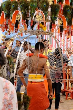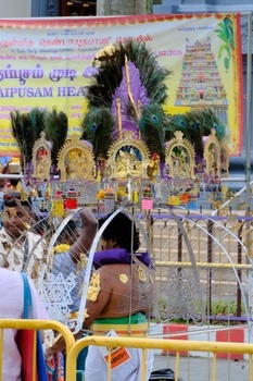 タイプーサムはタミル暦のタイの月(1~2月)、満月の日に行われる、ヒンドゥー教の神ムルガンが悪に勝利したことを祝う祭りです。祭りの参加者はムルガン神への感謝や贖罪を示すために48日前から禁欲的な生活をおくり、祭り当日は牛乳を入れたポットやカヴァディと呼ばれる飾りを担いでスリ・スリニヴァサ・ペルマル寺院からスリ・テンダユタパニ寺院まで約4㎞を行進します。特に敬虔な人びとは身体に数十本の鉤や串を刺してカヴァディを固定することでも知られ、こうしたタイプのカヴァディはインド本国以上にシンガポールやマレーシアで盛んだとも言われます。