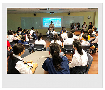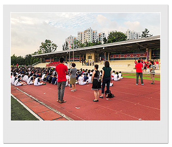 初日は6:45に学校に集合し、バスでRVHSへと向かいました。7:30からの全校朝礼では、国旗掲揚や国歌斉唱に加え、RVHS生徒会による紹介スピーチがあり、温かい歓迎を受けました。集合した時には硬かった表情も朝礼が終わるころには、すっかり解け笑顔が見られました。朝礼に続き、キャンパスツアーで校内を案内してもらった後には、授業に参加しました。それぞれのパートナーと一緒に英語での授業を楽しんだようです。その後、昼食を挟んで、午後はRVHSの生徒によるシンガポールに関するプレゼンテーションを聴きました。ところどころにジョークも交えられており、シンガポールについて楽しく学べたようです。放課後は、CCAと呼ばれるクラブ活動に参加しました。日常の部活動でやっている競技をRVHSと一緒に経験した生徒もいれば、MediaCorpを訪れ、観客として教育番組に出演するという経験をした生徒もいたようです。