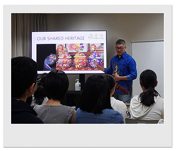 初めに、プラナカン文化について、生徒たちが事前学習で学んだことを振り返りながら、スライドを用いて説明して下さいました。その後、プラナカン文化成立の背景をなす歴史について触れていただいた上で、衣服や陶器、食事など具体的な例を取り上げ、それらがプラナカンたちの歴史や文化とどのように結びついているのか、お話くださいました。実際に生徒はプラナカンの服ケバックサロンやビーズのサンダルを身に着けてみたり、色鮮やかなタイルを手に取って見てみたりすることができました。