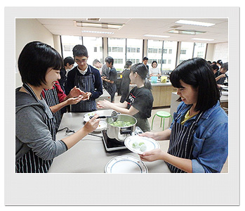 次に、調理室でプラナカン菓子Onde Ondeを作りました。パームシュガーをもち米・タピオカ粉・パンダンを混ぜた生地で包んで茹で上げ、ココナッツパウダーをまぶす工程を実践してみました。実際に自分たちで作ってみることによってより美味しくいただくことができ、プラナカンの食事をより身近に感じられたようです。シンガポールの多文化性を体現したプラナカン文化に触れることで大変充実した時間を過ごすことができました。