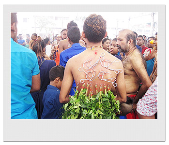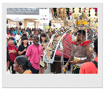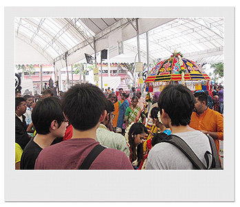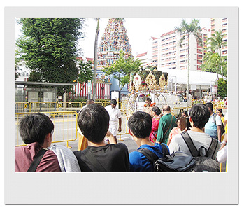 タイプーサム実施日には、行進の出発地点であるスリ・スリニヴァサ・ペルマル寺院を訪問しました。信者の体に針を刺す様子、重いカバディを運んでいる様子、そして家族や友人が音楽を用いて信者の方を支えている様子などを見学しました。中にはその光景を見て驚いている生徒もいましたが、タイプーサムに対する信者の方の真剣な姿を目にし、ヒンドゥー教信者の信仰心の強さを感じるとることができ、たいへん貴重な経験になりました。