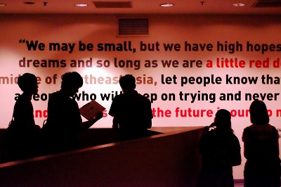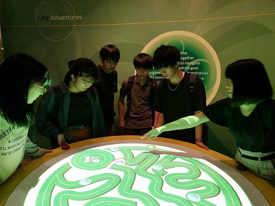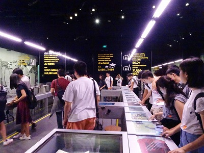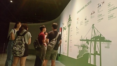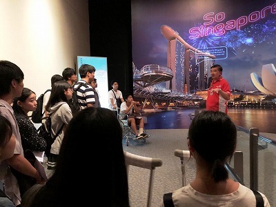 午前はDiscovery Centreを訪問し、シンガポール発展の歴史や現在の社会・経済・国防といった様々な特徴を、映像やアクティビティを通して学びました。施設の中にはリー・シェンロン首相の言葉が大きく掲げられ、国民が自国への理解を深めるとともに誇りや自信を抱くことを、国としてサポートしようという思いが感じられます。当日はシンガポール人の家族も多く来場しており、普段の生活の中に自国民としての意識が育まれている様子がうかがえました。生徒には事前にワークシートを配布しており、班員で協力しながら答えを探す姿があちこちで見られました。