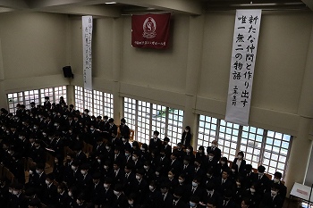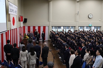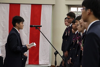 新入生代表宣誓は、「これから歩む三年間の道のりは決して平坦なものではないかもしれませんが、その三年間こそが私たちの人生を支える大きな財産の一つになると信じ、一歩一歩、しっかりと歩んでいきます。」という力強い宣誓がありました。そして在校生からは、「皆さんには多くの挑戦の機会があります。だからこそ、その機会を不意にせずに、とりあえずチャレンジしてみてください。きっとそこで得たものは自らの糧となるはずです。」という歓迎の言葉が述べられ、厳粛かつ温かな雰囲気に包まれた入学式となりました。