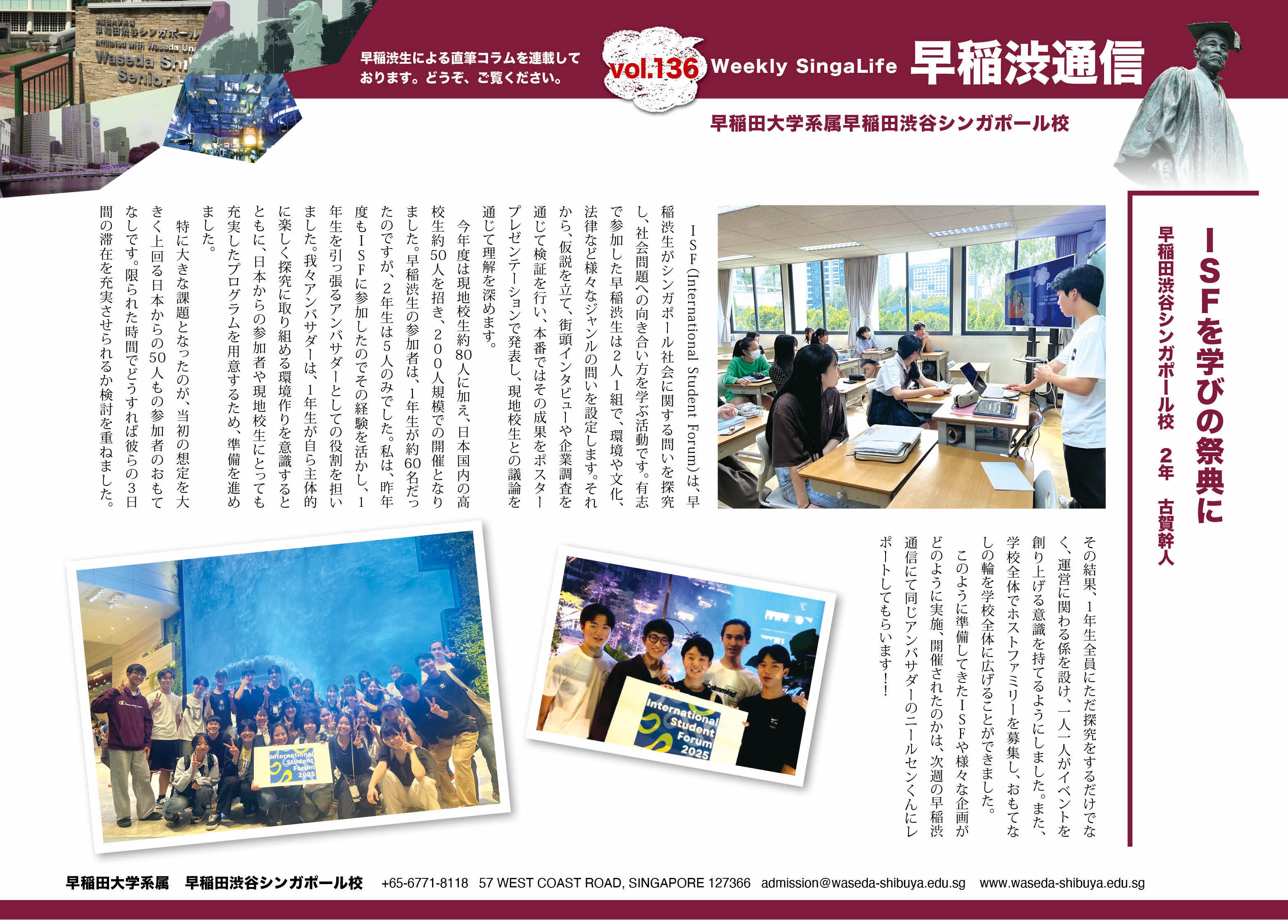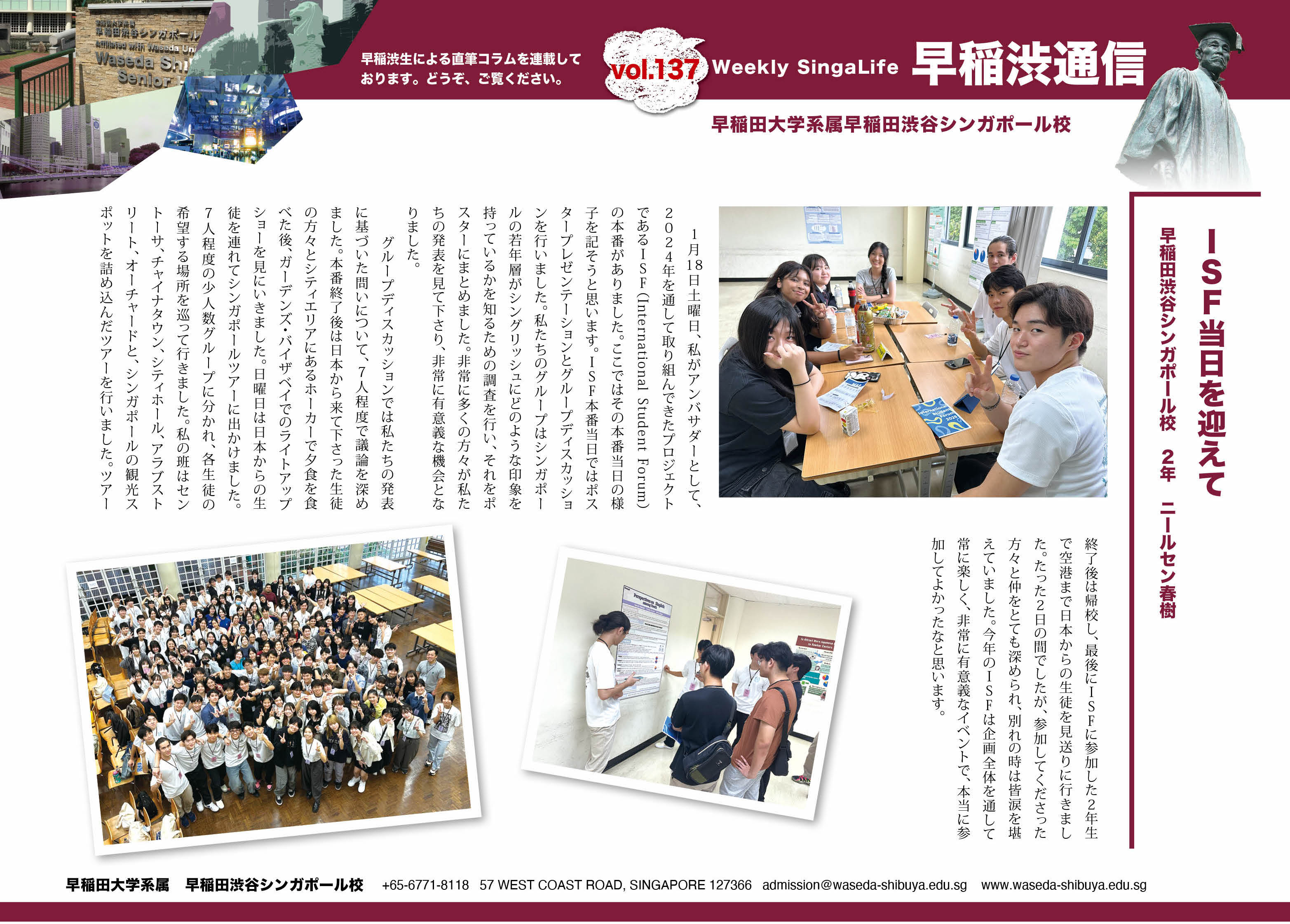 2025年1月に本校にて実施しましたISF(International Student Forum)について、Singalife誌の早稲渋通信にて、本校3年生の古賀幹人さんとニールセン春樹さんがコラムを寄稿しました。ISF史上最大規模の会となり、アンバサダーとして事前準備と当日の運営に奮闘した二人の様子が伝わってきます。