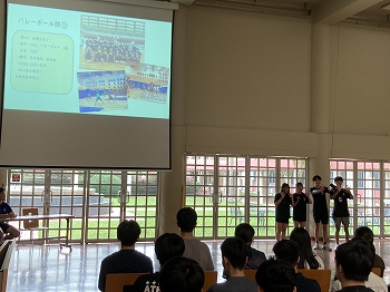 委員会紹介では、それぞれが日頃の学校生活や学校行事においてどのように関わっているのか、そして2,3年生がそれぞれの立場で学校を前向きに盛り上げようとしていることが、大いに伝わるスピーチでした。1年生は、これから自分がどのような立場で学校に関わっていこうかと、高校生活への期待がさらに高まったようでした。