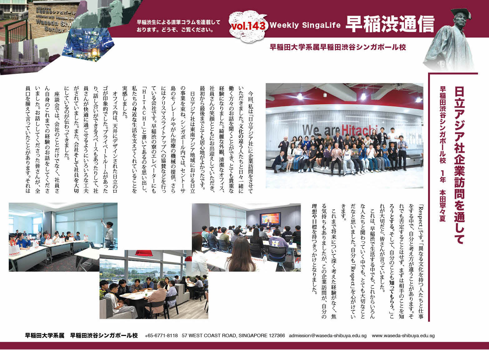 本校1年生、本田寧々夏さんが、日立アジア社企業訪問の様子や感じたことを綴りました。寮のエレベーターに書かれたHITACHIのロゴを思い出し、身近な生活を支えられていることを実感したようです。