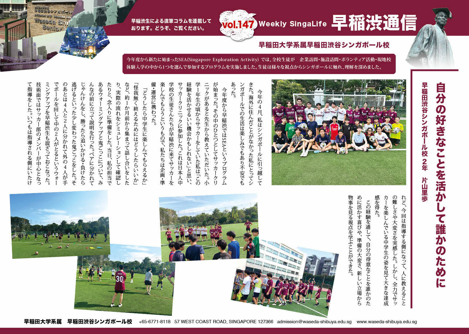 本校2年生、片山里歩さんが、中学生向けサッカークリニックの運営に参加した経験についてコラムを寄稿しました。得意なことを生かし、計画から当日の指導までおこなうという体験を通して、責任や喜び・大きな達成感を感じたようです。