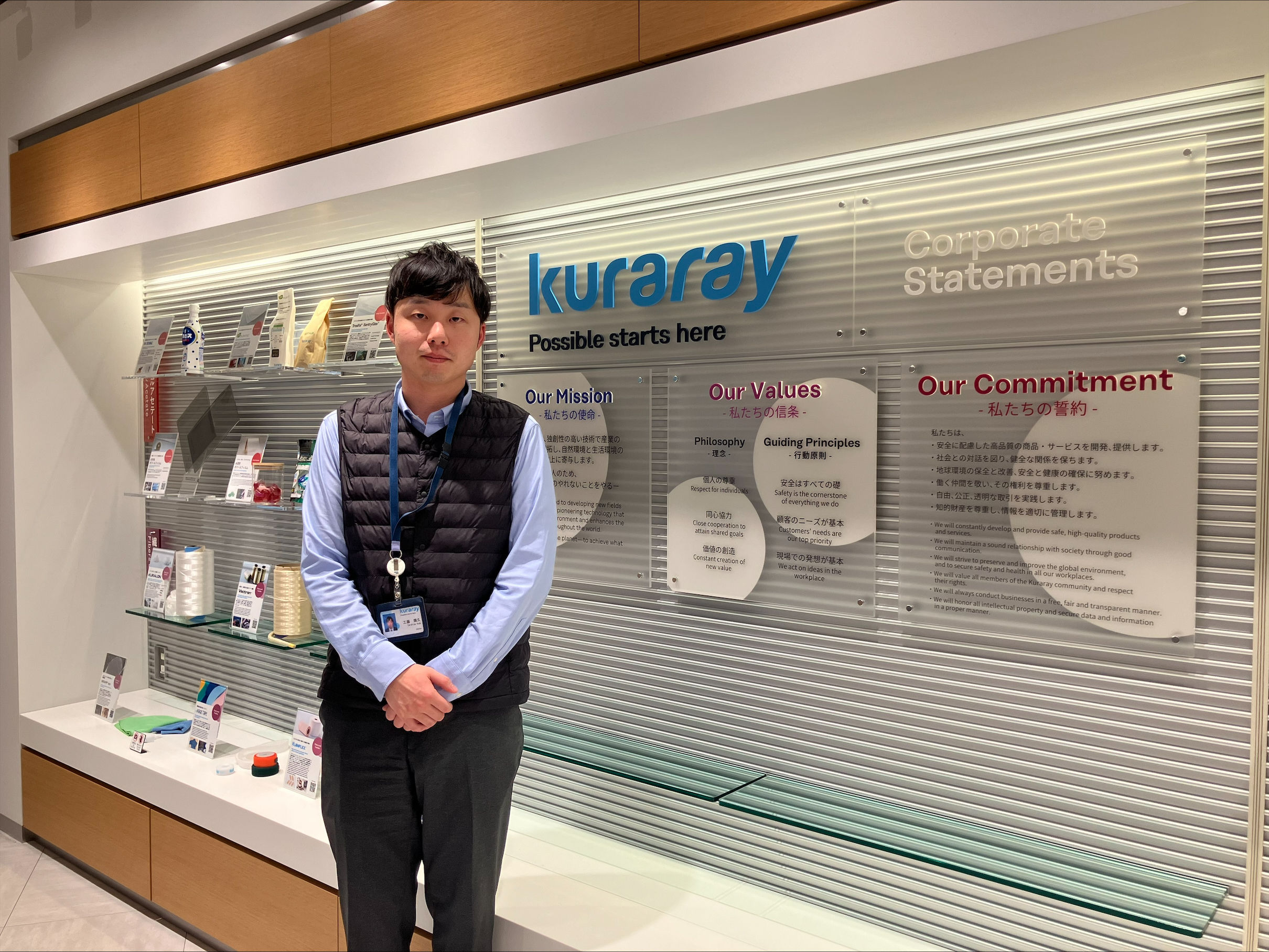 現在、私はスポーツ&アウトドア領域のマーケティングを担当しています。事業部同士を繋ぐ横串活動や、顧客のニーズに基づいた製品や開発コンセプトの紹介を行っています。世界中のスポーツ・アパレルブランドに、自社の製品や技術を提案するやりがいのある仕事です。大学院では化学を専攻していたこともあり、入社前は研究開発を志望し、入社後も当初は研究開発に従事しておりました。研究開発部時代に「この素材がこんな用途で使われていたのか!」と感銘を受けたことがあります。その経験から、市場に近い環境に身を置き、顧客を身近に感じながら、新規用途や市場の開発に携わりたいと考えるようになりました。そして、現職に至ります。