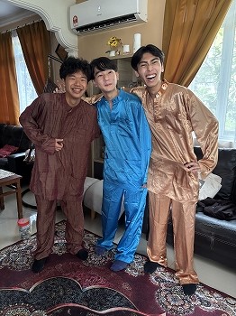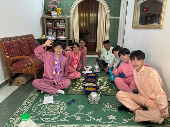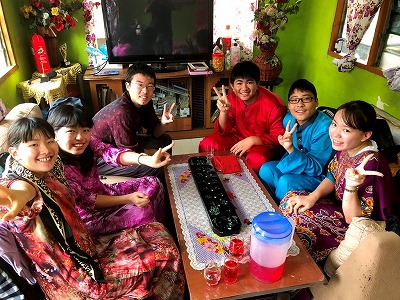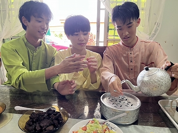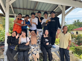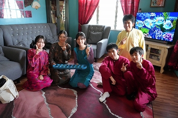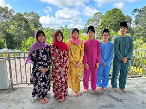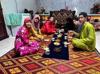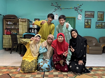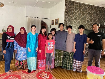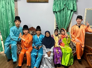 生徒たちは地元のホストファミリーに温かく迎えられ、伝統的なマレー衣装を着せてもらいました。また、マレー料理を味わい、右手だけを使って食べる伝統的な食事作法に挑戦しましたが、思った以上に難しく感じたようです。さらに、マレーの伝統的な遊びを楽しみ、カレーパフ作りにも挑戦しました。わずか3時間ほどの滞在でしたが、生徒たちはホストファミリーとの別れを惜しんでいました。