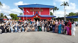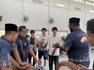 2日目は、ジョホール州のシナランバル村でマレーシアの生活と文化を体験するホームビジットを行いました。民族楽器を用いた音楽で歓迎された後、村長主催の式典に参加し、班ごとにホームビジットを行いました。訪問したご家庭では簡単な自己紹介を行った後、マレースタイルの昼食をいただきました。右手のみを使っての食事に苦戦する場面も見られましたが、普段とは違う味付けされたマレー料理をいただきました。昼食後は民族衣装に着替えて、マレーシアの伝統的なゲームであるチョンカに挑戦したり、おやつとして親しまれているカレーパフを作ったりと、様々な経験を積むことができました。