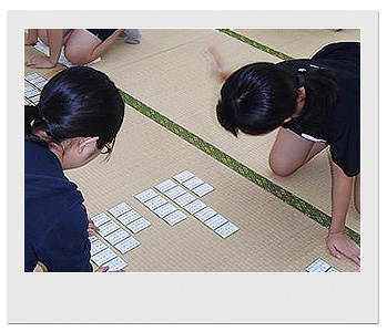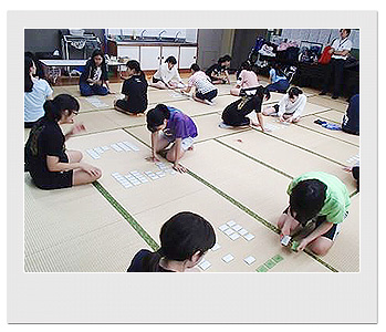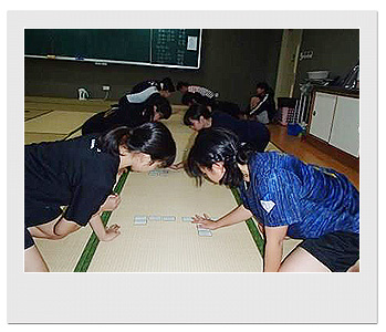 2日日は、朝食後に「読み」の練習を行いました。札の読み方は競技かるた独特のものなのですが、みんなで1首ずつ読み上げることで取り手の聴き心地を意識した読み方を学ぶことができたと思います。