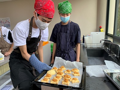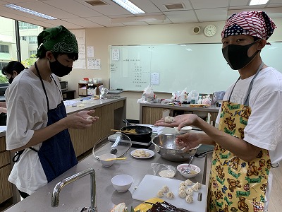 今回はチャイニーズニューイヤーも間近ということで、パイナップルタルトと小籠包に挑戦しました。パイナップルタルトは、クッキー生地の上にパイナップルジャムをのせて焼き上げたお菓子です。パイナップルは富のシンボルとされ、旧正月の飾りで用いられており、パイナップルタルトは特にこの時期、様々なところで売られています。私たちはパイナップルジャムもクッキー生地も一から作りましたが、おいしく出来上がりました。小籠包はゼラチンで固めたスープを入れ、食べた際にスープがあふれ出るようにしました。フライパンで作りましたが本格的でおいしいものができました。