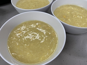 一品目には中華風コーンスープをつくりました。とろみをつけてかき混ぜたスープに卵を回し入れると、かき混ぜたときのスープの動きにより、ふんわりとしたかき玉に仕上がることを学びました。