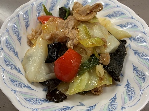 二品目には日本でも家庭料理として定着している四川料理の回鍋肉をつくりました。「回鍋」とは鍋を「回す」のではなく、「戻す」という意味だそうです。本来は豚のブロック肉を鍋でゆでて取り出し、薄切りにしてから鍋に戻し、野菜と炒め合わせる料理ですが、今回は薄切りのバラ肉を使用して調理しました。
