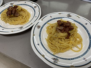 今回の調理実習では、イタリアンの基礎である、水と油をくっつける「乳化」の技術を学ぶために、「にんにくと赤唐辛子のスパゲティ」と「カルボナーラ」をつくりました。「乳化剤」としてパスタのでんぷんが出た茹で汁をソースに加えるテクニックと、パスタをあえる時に、追加の「乳化剤」としてバターを加えるテクニックを練習しました。