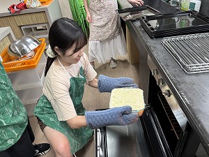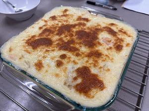 10月24日(木)の活動では、「実は日本発祥の料理」というテーマでえびドリアを作りました。調べ学習では、ドリアはホテルニューグランドの初代料理長が、体調のすぐれない客の要望を受けて即興で考案した料理だということを学びました。今回作ったドリアは、えびやマッシュルームの風味が効いたおいしい仕上がりとなりました。最後には、各グループのドリアを先生に審査してもらい、一番おいしかったグループを決めました。