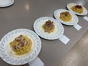 使用したレシピは、予約の取れないことで有名な「ラ・ベットラ・ダ・オチアイ」の落合務シェフによるものです。「火からおろす」「混ぜる」「火にかける」を何度も繰り返しながら、とろとろのソースに仕上げる練習を行いました。火加減が強すぎると卵が固まりダマになってしまうため、焦らず丁寧に調理することがポイントでした。レシピどおりに作ることで、スパゲッティとソースがしっかりと絡んだ、本格的なカルボナーラが完成しました。