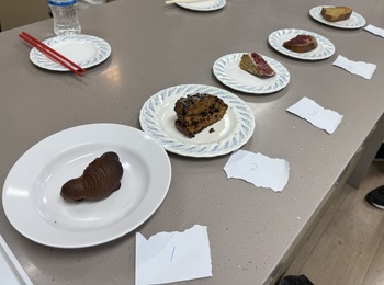 6月12日の活動では、ガトーヤウーを作りました。フランスのヨーグルトケーキのガトーヤウーは、簡単な材料から手軽に作ることができるケーキです。きび砂糖を使った素朴な甘さのガトーヤウーに、甘酸っぱいラズベリージャムを合わせたり、チョコチップを入れたりといった班ごとの工夫を楽しみました。班ごとに焼き上がりの食感や味に違いが出て、お菓子作りの奥深さを感じられました。