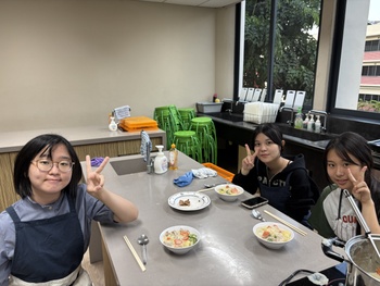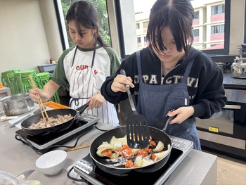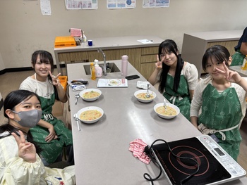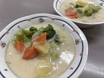 今回はルーを使わず、小麦粉からソースを手作りしました。「すべての野菜がやわらかくなっていること」と「牛乳が分離せず、白く仕上がっていること」を目標に、どのグループもレシピに記載された調理のポイントをしっかりと守って取り組みました。小麦粉を焦がしてしまうとソースの色が茶色っぽくなってしまうため、温度の調節が難しい工程でしたが、最終的には、さらりとなめらかなとろみのある、おいしいクリームシチューに仕上がりました。