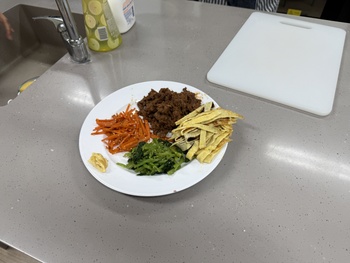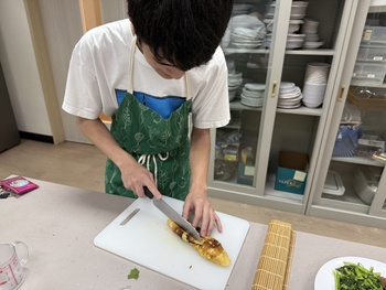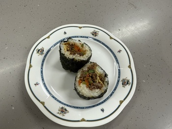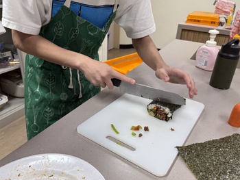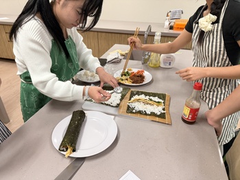 11月14日の活動では、韓国料理をテーマにキンパを作りました。キンパを作る前に事前学習として「キンパとは何か」、「海苔巻きとの違いは何か」について調べました。キンパは、牛肉、にんじんナムル、ほうれん草、卵焼きなどを加熱調理して、ごま油で味付けしたものです。お弁当のような感覚で日本でいうおにぎりと近い感覚で食べられています。海苔巻きの具材のメインは生魚介類で、他には卵焼き、かんぴょう、きゅうりなどを入れます。お祝いやおもてなしなどの特別な日の食事として食べられています。グループのみんなで協力して具材を調理し、巻きすを使ってキンパを巻きました。グループによって大きさや太さが異なっていて、それぞれに個性が出ていてとても良かったです。