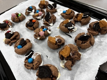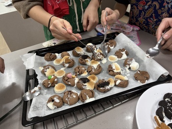 1月22日の活動では、スモアクッキーを作りました。活動の前に調べ学習として、「スモアクッキーとは何か」、「スモアとは何か」について調べました。スモアクッキーとは、アメリカの伝統的なお菓子である「スモア(S’more)」をクッキー風にアレンジしたスイーツです。スモアは、グラハムクラッカーでチョコレートと焼いたマシュマロを挟んで食べるキャンプの定番デザートで、「Some more(もう少しほしい)」という言葉が名前の由来とされています。今回は、スモアクッキーの飾り付けもしました。みんな、個性のあるクッキーをたくさん作りました。