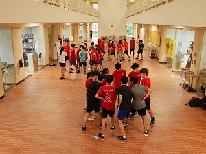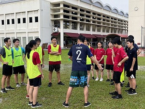 SASの選手たちが来校されたときはまだ雨が降っていたので、少しの間、選手交流として本校1階のピロティで選手同士の交流の時間をもちました。「Show」と呼ばれるミニゲームなどをして雨が止むのを待ちました。お互いの自己紹介を含め、英語を使って交流する機会が得られ、外国人の友だちができた生徒もいたりと、有意義な時間となりました。