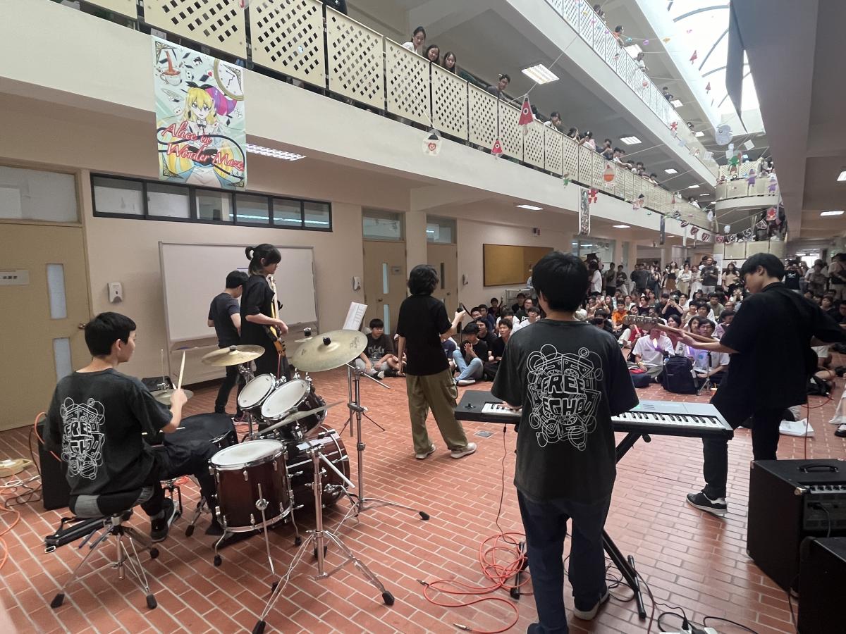 私たちMMA部は、今年の星蘭祭で、多くの部員と大学生の皆さんと共に、さまざまな形態でバンド演奏を行いました。1年生は今年初めて楽器に触った人が多かったにもかかわらず、クオリティの高い演奏を披露しました。3年生は最後の星蘭祭を、多くの曲とともに大いに盛り上げてくださいました。特に、私たちの世代の曲でもある「ゲッタバンバン」では、生徒一丸となって盛り上がることができました。数ある思い出の中でも、私が個人的に最も印象に残っているのが、SUTDの大学生とのコラボバンド演奏です。