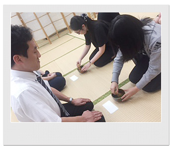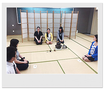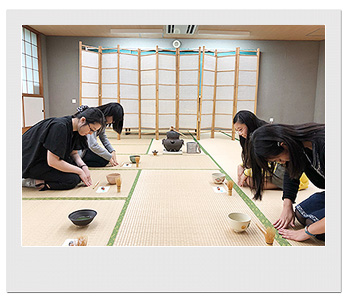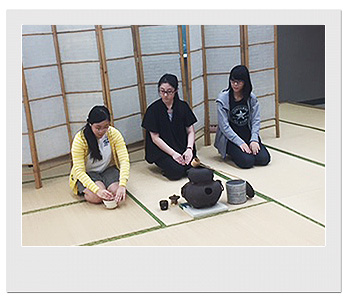 私たち茶道部は、週に1回「遠州流茶道」のお稽古を行っています。毎週NUS茶道部の学生の方たちも一緒にお稽古をするため、英語を使う機会や国際交流の機会が非常に多く、日本文化を学びながら異文化交流が出来る有意義で楽しい部活です。